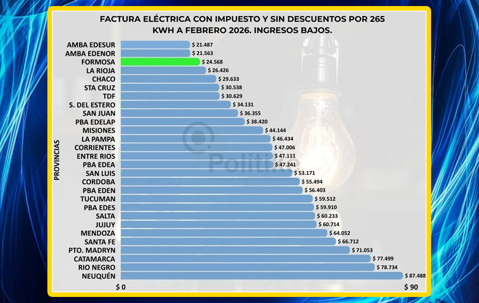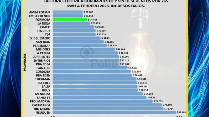 Al desglosar los datos por provincia, se observa que Formosa es una de las jurisdicciones del país con la factura eléctrica más baja para ingresos bajos, con valores de $24568 (N2), a valores de febrero de 2026.