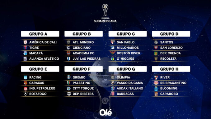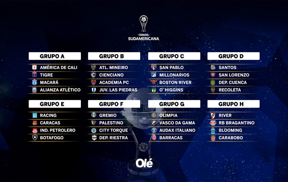 El Tigre de Diego Dabove quedó en el Grupo A e irá con América de Cali, Macará y Alianza Atlético. Deportivo Riestra, debutante en competencia internacional, cayó en el Grupo F y se cruzará con el poderoso Gremio de Porto Alegre, Palestino de Chile y Montevideo City Torque, equipo uruguayo perteneciente al Grupo City.