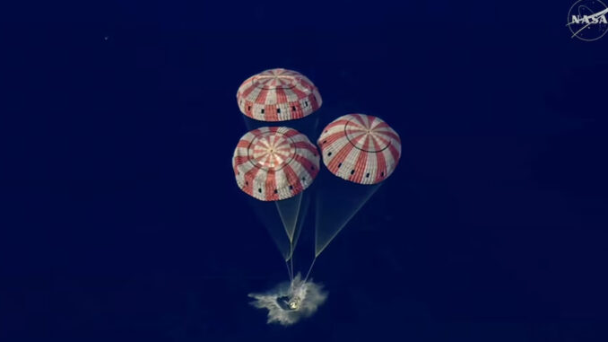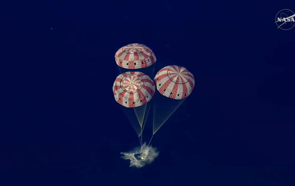 A 8.077 metros sobre el océano, la cápsula redujo su velocidad a 523 km/h gracias al frenado atmosférico. En ese punto, se activaron los sistemas pirotécnicos para el despliegue secuencial de los paracaídas. Primero, tres paracaídas de la cubierta de la bahía delantera de 2,1 metros de diámetro. Luego, dos paracaídas de frenado de 7 metros y, finalmente, a 2.896 metros, los tres paracaídas principales de 35,3 metros de diámetro y 140 kilogramos de peso cada uno. Este sistema desacelera la cápsula a menos de 32 km/h, la velocidad óptima para un amerizaje controlado.