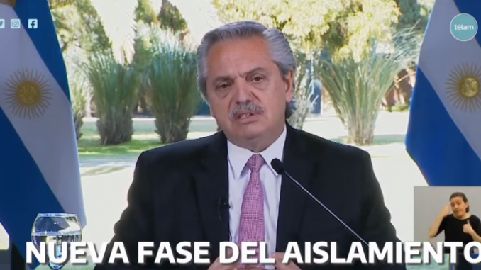 El presidente Alberto Fernández adelantó hoy que, a partir de mañana y en un proceso gradual, se va a “tratar de volver a la vida habitual, escalonadamente», aunque asumió que será «un mundo diferente que exige más cuidados”, al anunciar la extensión del aislamiento social, preventivo y obligatorio (ASPO) en el marco de la pandemia de coronavirus.