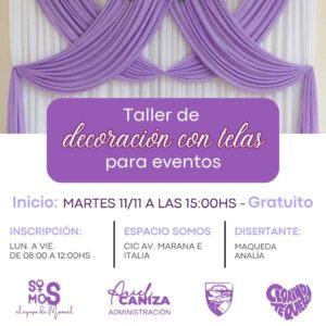 La Municipalidad de Clorinda cuenta con un numero muy importante de ofertas de capacitación que surgen de distintas áreas, algunas del Punto Digital, otras de la oficina de Servicios de Empleo, pero también hay otras oficinas que instrumentan capacitaciones, como la gente de SOMOS que recientemente informo que existen nuevas ofertas de cursos, por un lado, el taller de decoración con telas, para eventos.