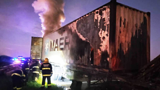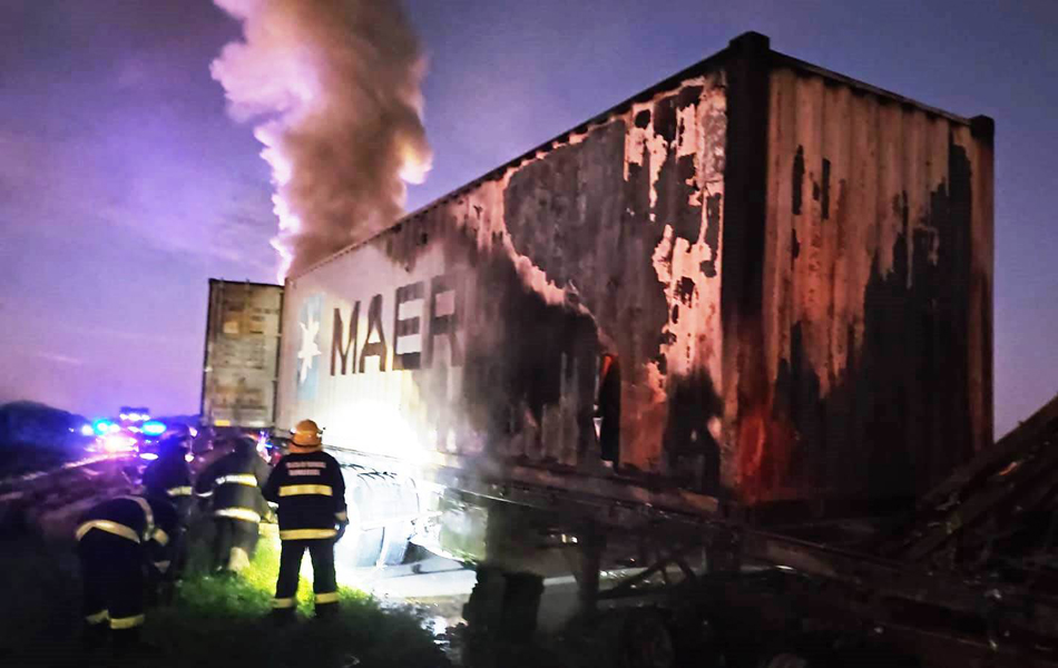 Integrantes de la fuerza provincial trabajaron intensamente para apagar el incendio de un camión sobre la ruta nacional N° 11, a la altura del kilómetro 1.195.