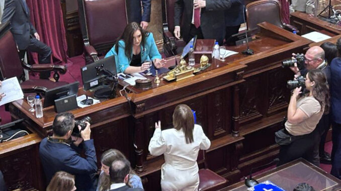 Ya en el recinto, la nueva jefa de bloque de La Libertad Avanza en el Senado se sentó en la segunda fila del flanco derecho del hemiciclo de la Cámara alta. Rodeada de sus nuevos compañeros de bancada -cada uno de los que llegaba se acercaba a saludarla-, se hizo oír cuando la sesión llegó a su fin y elevó su reclamo ante la vicepresidenta de la Nación.