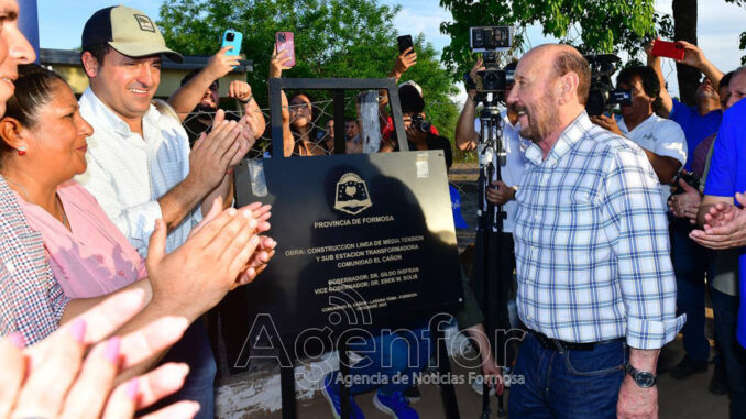 El gobernador Gildo Insfrán inauguró la Línea de Media Tensión que suministrará energía eléctrica las 24 horas a las comunidades de los parajes El Quemado Nuevo y El Cañón a partir de ahora, al visitar a esas dos comunidades que están en la jurisdicción de Laguna Yema en el Departamento Bermejo durante la tarde noche de este viernes 5.