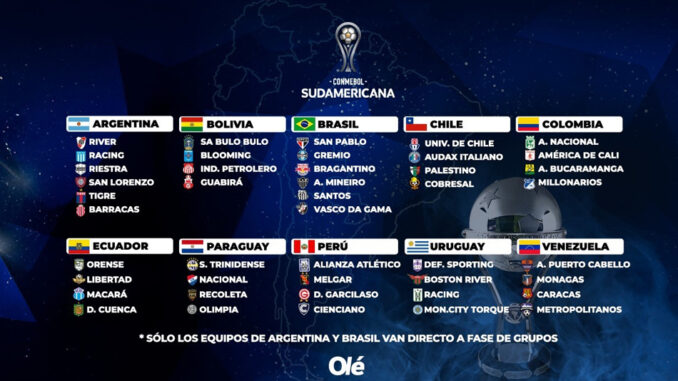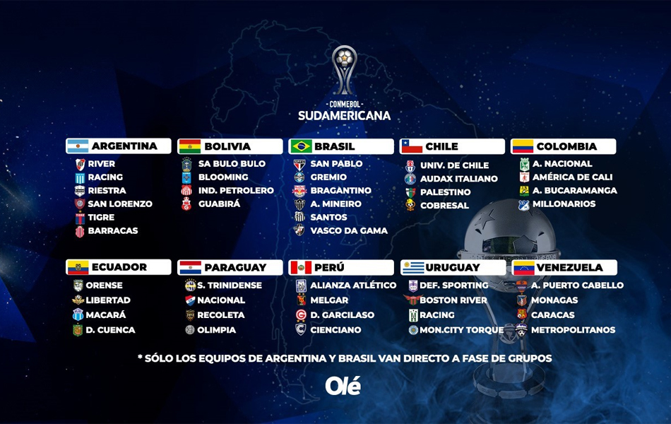 La primera fase la disputarán 32 equipos (cuatro de cada uno de los ocho países que no son Argentina y Brasil). De ahí saldrán 16, que se sumarán a los seis argentinos (, seis brasileños y cuatro provenientes de la fase 3 de la Libertadores para completar los 32 que compondrán los grupos.