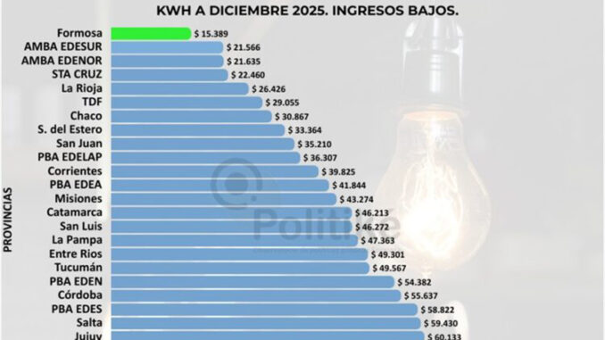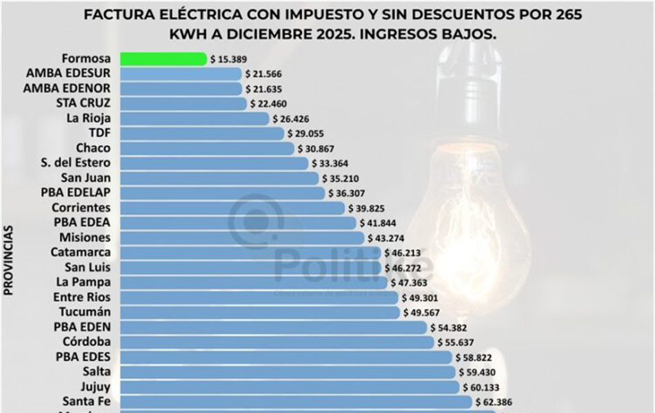 Los resultados muestran que la factura promedio en el país para un hogar de ingresos bajos es de $45.912 mientras que para un hogar de ingresos medios asciende a $53.420. Al desglosar los datos por provincia, se distinguió que Formosa es la jurisdicción del país con la factura eléctrica más baja para ambos niveles de ingreso, con valores de $15.389 (N2: Ingresos Bajos) y $20.153 (N3: Ingresos Medios), a valores de diciembre de 2025.