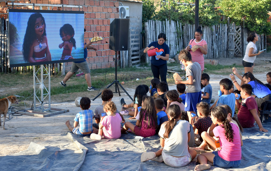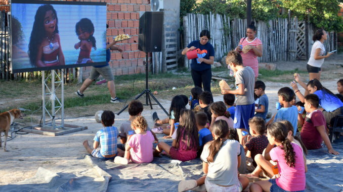 La Dirección de Juventud – Municipalidad de Clorinda continua trabajando con el microcine itinerante y en la tarde de ayer visitaron el Barrio ACA. En la canchita del mencionado sector, se estuvo compartiendo una rica merienda seguida de la proyección de una película, además se realizaron encuentros de fútbol y diversos juegos recreativos junto a los niños y niñas que se acercaron a disfrutar de la jornada