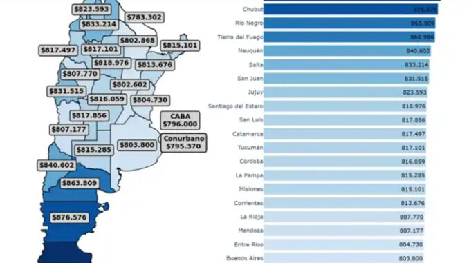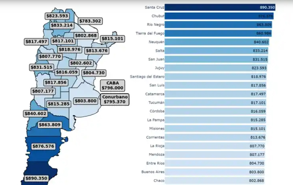 Por encima de Formosa, el Conurbano bonaerense, con un changuito de $795.370, y la Ciudad de Buenos Aires, con $796.000, completan el podio de las zonas más accesibles para esta canasta específica. En el otro extremo, entre las provincias con los valores más elevados, a Santa Cruz ($890.350) le siguen Chubut ($876.576), Río Negro ($863.809) y Tierra del Fuego ($860.986).