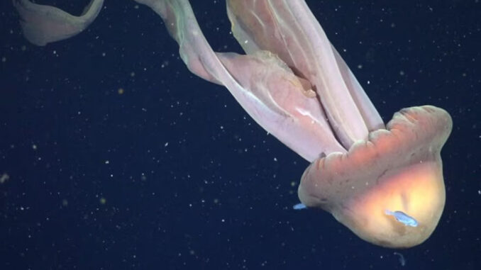Durante uno de los puntos clave de la travesía, los especialistas avistaron a la Stygiomedusa gigantea, considerada una de las criaturas más extrañas del océano profundo. Su presencia fue documentada a 253 metros de profundidad en el talud continental argentino. Según dijeron los investigadores en un comunicado, el ejemplar medía aproximadamente 11 metros. Se trata de “una rara medusa fantasma, una medusa de aguas profundas que puede crecer tanto como un autobús escolar”, afirmaron